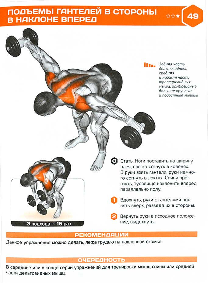 Разные углы наклона: Изменение угла наклона корпуса при выполнении разведений гантелей может значительно повлиять на активацию различных мышечных групп. Например, наклон вперед на 30-45 градусов акцентирует нагрузку на задние дельты и верхнюю часть спины, в то время как более горизонтальное положение может задействовать широчайшие мышцы спины.