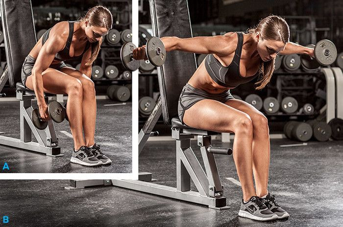 Начинающим атлетам рекомендуется выполнять упражнение сидя на скамье. Хотя это может снизить эффективность, такой подход минимизирует риск травм. Девушкам стоит выполнять разведение гантелей в наклоне в сидячем положении, так как это помогает сформировать рельефные мышцы без гипертрофии, сохраняя женственные линии фигуры. Для выполнения тренировки необходимо: