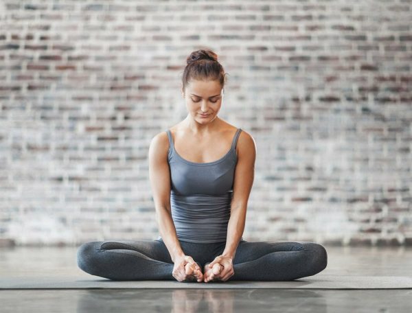 Согните ноги в коленях и прислоните стопы друг к другу, плавно притягивая их к тазу. Держите спину ровно. С сохранением нейтрального положения позвоночника на выдохе плавно наклонитесь вперед. Дополнительно можно слегка надавить ладонями на колени, стараясь опустить их ближе к полу.