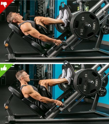 Для повышения эффективности тренировки помните: если расположить ступни ближе к верхнему краю платформы, активнее будут работать задние мышцы бедра, а если дальше — квадрицепсы. Будьте осторожны: сгибать ноги в таком положении сложно, а отрыв пяток может привести к травме коленей.