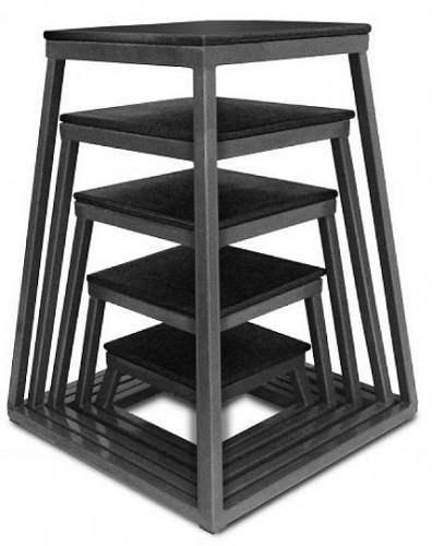 Тумбы для запрыгивания в комплекте. Назначение: домашнее или профессиональное. Ножки под небольшим углом повышают устойчивость конструкции, а верхняя поверхность прорезинена для хорошего сцепления. Коническая рамочная форма позволяет вставлять плиобоксы один в другой для переноски и хранения.