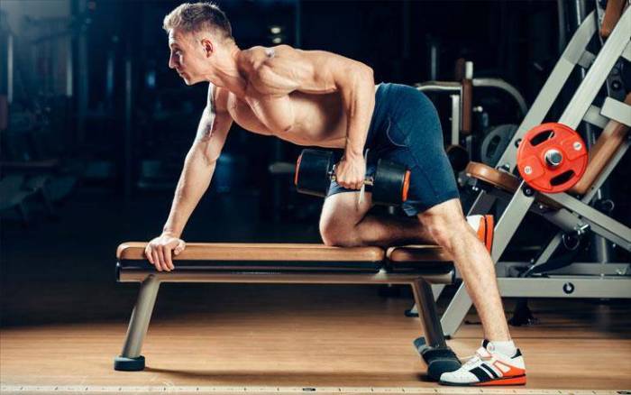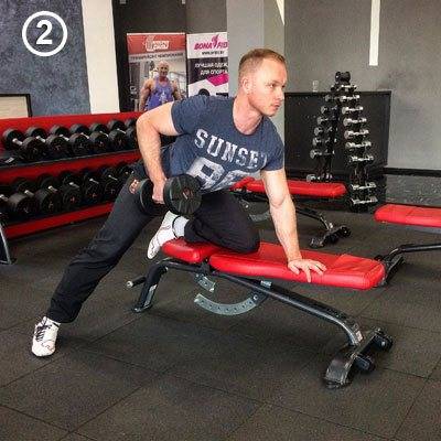 - Если у вас есть скамья, обопритесь на скамью свободной рукой и коленом ноги. Ваш корпус должен находиться под большим углом подъема, локоть увеличивает амплитуду движения, чтобы бицепс был не задействован. Если скамьи нет, можно сделать одной ногой широкий шаг вперед. Вторую ногу при этом согните немного. В случае, когда вы хотите делать упражнение без выпада, немного согните ноги в коленях.