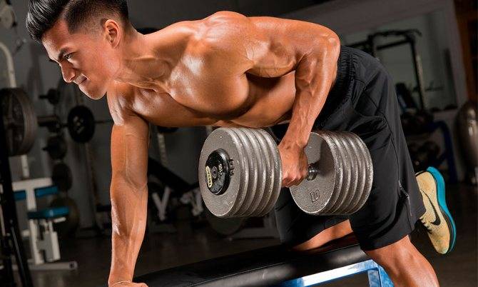 - В зависимости от положения, тягу гантели можно выполнять стоя, или с упором о скамью.
