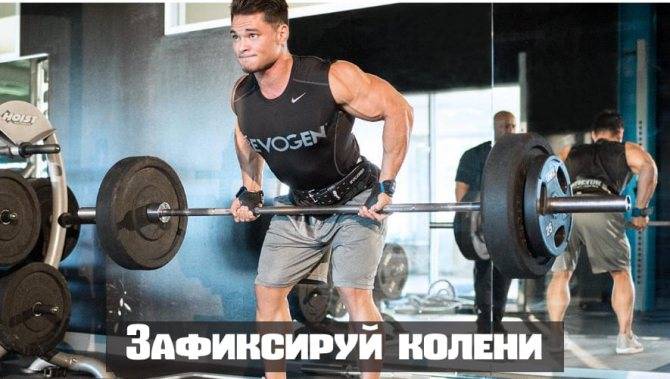 С одной стороны может показаться, что ноги не играют никакой большой роли в данном упражнении. Но это не так. От сгиба коленей зависит ваше равновесие и положение спины. Если вы согнете ноги слишком сильно, ваш таз смещается вниз. Следовательно, поясница округляется, а какие от этого бывают последствия читайте выше. Так же труднее будет фиксировать положение штанги. Если же мы полностью распрямим ноги, весь основной вес сместится вперед и придется на поясницу. Также снизится величина рабочего веса. Поэтому колени должны быть немного согнуты. Рекомендуют 10-20°