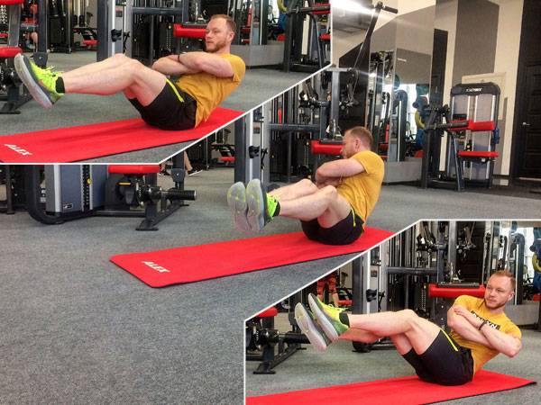 - Сядьте на ровную поверхность. Прижмите руки к торсу. Согните ноги в коленях. Слегка наклоните торс назад, одновременно приподняв ноги, чтобы опора приходилась на таз.