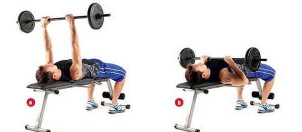 - Ложитесь на горизонтальную скамью, обхватите гриф узким хватом (12-15 см между ладоней).