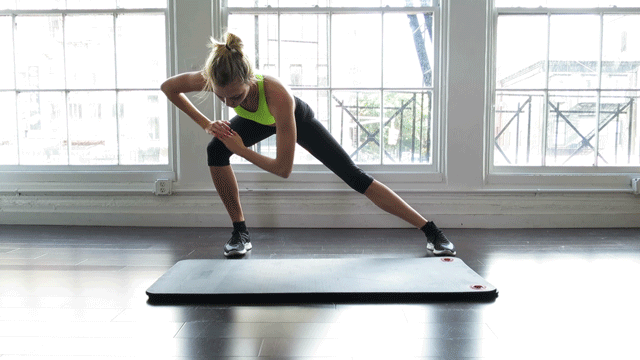 Из положения стоя делаем широкий выпад вперед так, чтобы одна из ног была согнута под острым углом, а вторая – прямая. Вес тела переносим вперед, остаемся в таком положении на некоторое время. Повторить по 5 раз на каждую ногу.