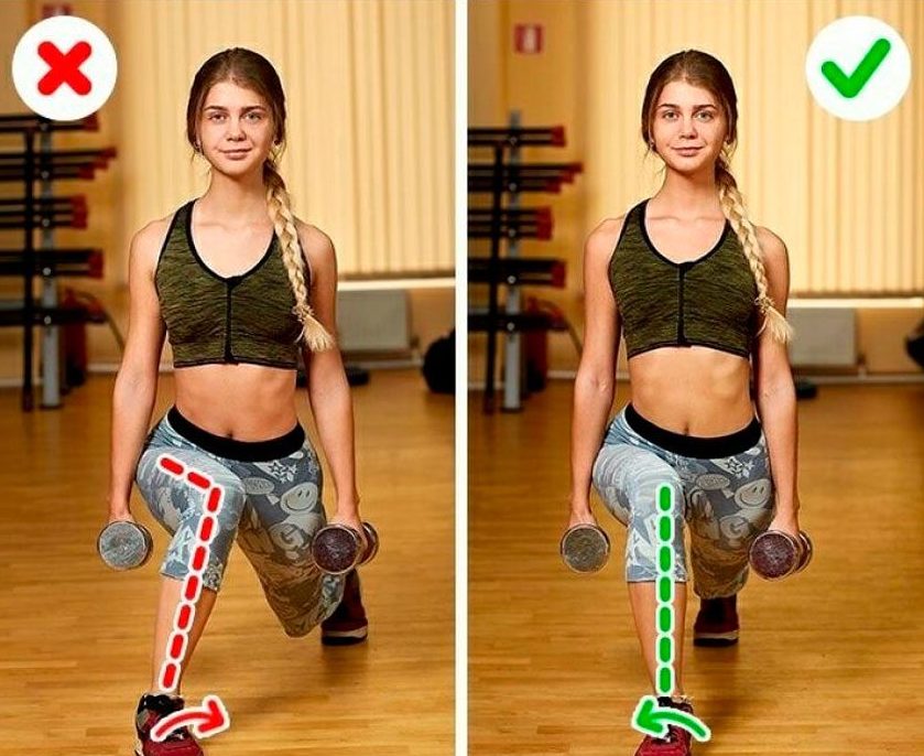 При выполнении выпадов с гантелями новичок может совершить следующие ошибки: