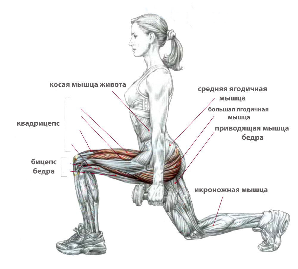 Выпады с гантелями — универсальное упражнение, которое нагружает квадрицепсы, бицепсы бедер, ягодичные и икроножные мышцы. Для координации и равновесия работают стабилизаторы: широчайшие, ромбовидные и трапециевидные мышцы спины, а также пресс. При использовании отягощений (гантелей или штанги) статическая нагрузка затрагивает плечи, предплечья и запястья.