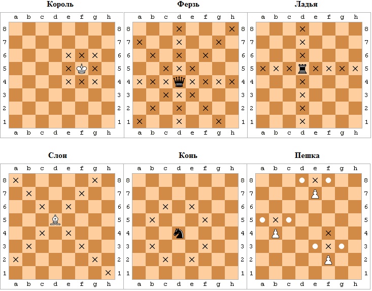На шахматной доске представлены шесть типов фигур: ферзь, король, конь, слон, ладья и пешка. Новичкам важно знать их названия.