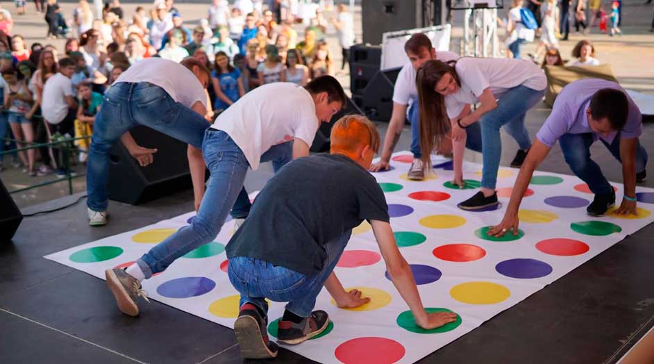 Это игра на полу с яркими кругами, по которым нужно передвигаться, называется «TwisterMax» и может принимать до 6 участников. Игра включает несколько активных форматов, и правила зависят от выбранного режима: