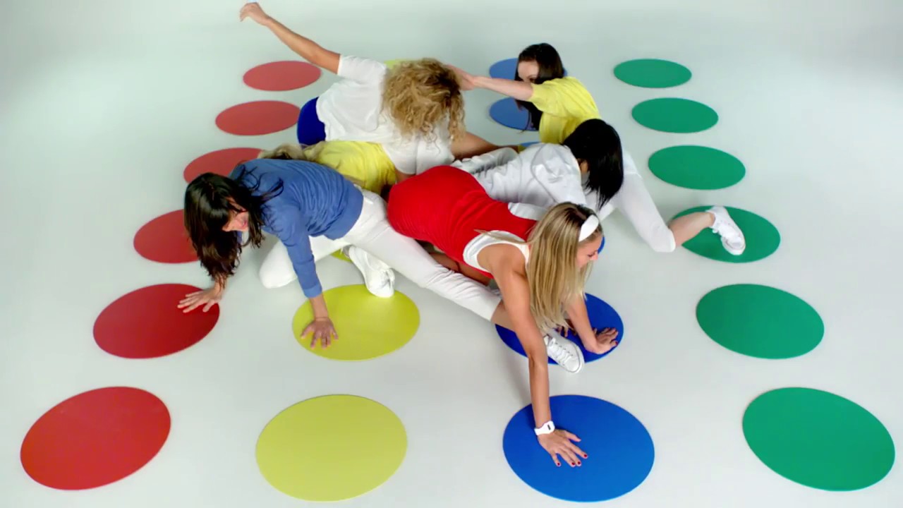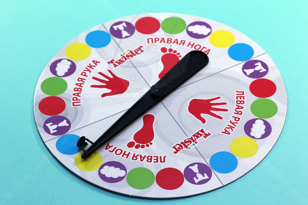 На полу расстилают коврик для игры с кругами четырех цветов: желтым, красным, зеленым и синим. Они расположены по 6 штук в 4 вертикальных ряда. Ведущий крутит рулетку, которая поделена на 4 зоны, где указаны цвета и конечности – руки или ноги. Если стрелка остановилась, например, на зеленой зоне с рукой, участник должен поставить руку на зеленый круг и так далее.