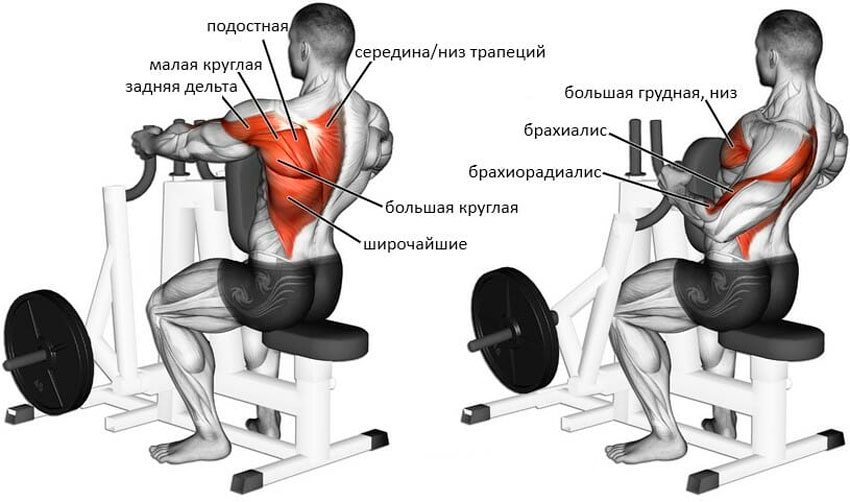 Рычажная тяга в тренажере выполняется в сидячем положении с фиксацией коленей под валиками, ноги должны быть плотно прижаты к полу. При горизонтальной тяге опора осуществляется в области грудной клетки с помощью специальных подушек на тренажерах.