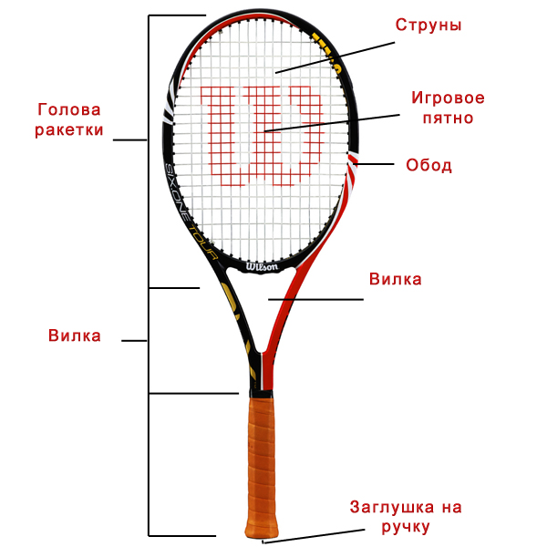 Основные компоненты теннисной ракетки: голова, ручка и вилка.