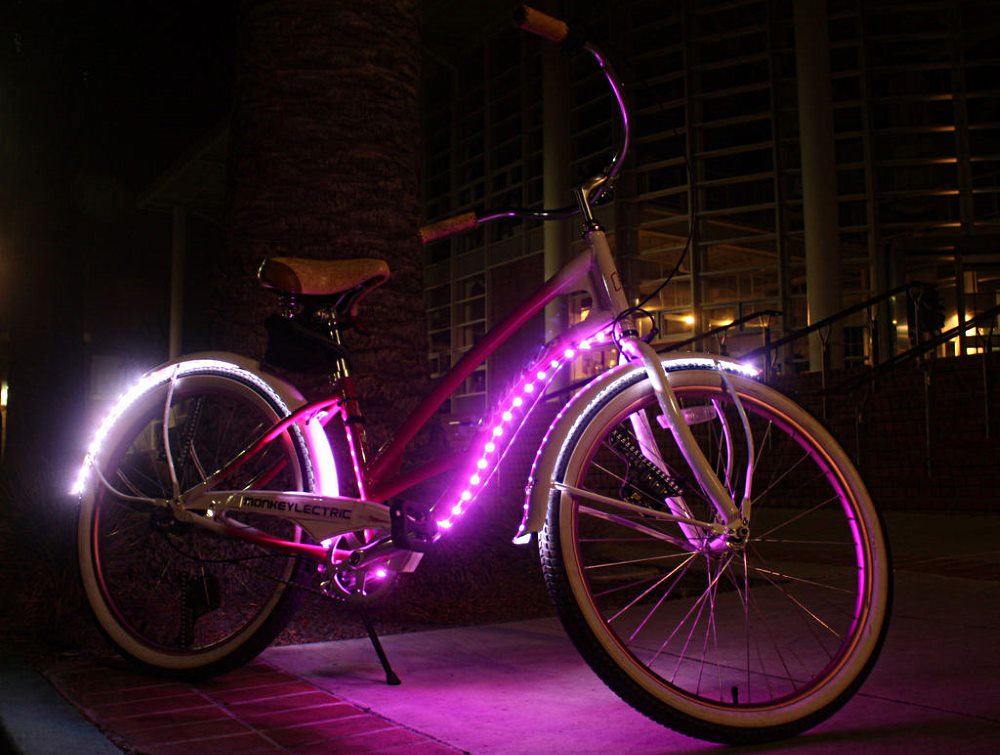 - Светодиодная подсветка. Ленты светодиодов любого цвета продаются в большинстве строительных магазинов. Также понадобится крепление и источник питания. Их устанавливают вдоль рамы, рулевой колонки, подседельного штыря. Место скрепления ленты и источника питания обязательно надежно фиксируют силиконовым герметиком.