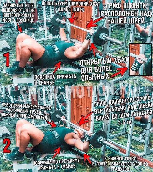 Хват: Можно использовать открытый хват, если вы опытный атлет. Новичкам я советую использовать закрытый хват. УБЕРИТЕ МОСТ, прижмите вашу спину плотно к скамье! Можете дополнительно ЗАКИНУТЬ НОГИ НАВЕРХ (как на картинке чуть ниже) чтобы изолировать грудные мышцы. Так вы сможете поднять меньший вес, но зато НАГРУЗКА УЙДЁТ ЧИСТО В ГРУДНЫЕ МЫШЦЫ, а не размажется по ногам, передней дельте, трицепсу и спине. Начинаем опускать гриф штанги СТРОГО ВЕРТИКАЛЬНО над нашей шеей, во время опускания выполняем глубокий вдох. Опускаем гриф до расстояния в 3-5 см до нашей шеи, чувствуем напряжение и растяжение в наших грудных, можно дополнительно задержаться в таком положении на 1 секунду. После этого мощным движением выжимаем гриф штанги ВВЕРХ над нашей шеей, одновременно выдыхая воздух