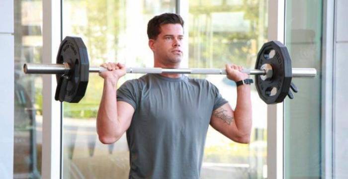 - Взяться руками за гриф чуть шире плеч так, чтобы предплечье было перпендикулярно полу;