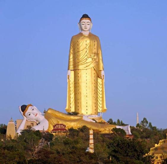 Эта скульптура посвящена Будде, а находится она неподалеку от города Моунъюа, в сельской местности Мьянмы. Высота постамента составляет 13 метров. Монументальную статую Будды начали строить в 1996 году, ее возведение заняло 12 лет. На момент своего создания объект стал самым высоким в мире в своем роде. Интересно и строение пьедестала. Он сформирован из двух ступеней. Первая – восьмигранник, похожий на продолговатую пирамиду с усеченными углами. Сверху на ней располагается уже овальная ступень. Основной цвет как основания, так и самого памятника – желтый. Сама статуя внутри пустая, там разместился музей творчества, связанного с буддизмом.