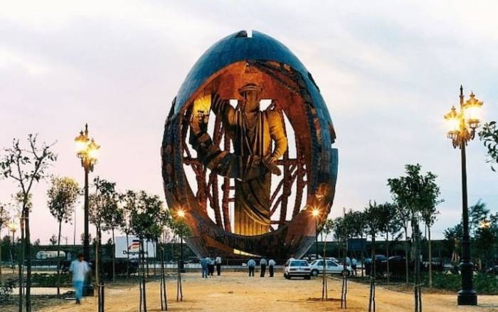 В честь 500-летия открытия Америки скульптор Зураб Церетели затеял масштабный проект. Работа «Рождение Нового Человека» стала первой композицией в общем ряду. В присутствии короля Испании в 1995 году в Севилье был открыт необычный памятник. Именно отсюда Колумб уходил в плавание. Внутри яйца-купола, образованного парусами и реями, стоит с картой в руках знаменитый мореплаватель. На парусах нанесены мальтийские кресты и названия трех каравелл. Необычная форма вызвана легендой о Колумбе, который показал, что яйцо можно вертикально поставить на стол, просто приплюснув основание.