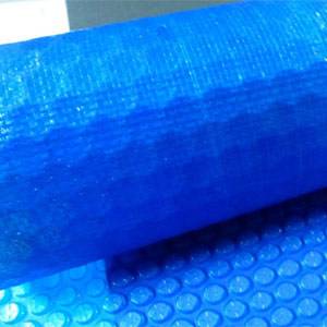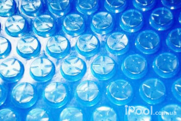 Вторым вариантом является плавающее покрывало, выполненное их пузырькового покрытия, из полиэтилена или ПВХ. Такое покрывало защищает чашу от мусора, препятствует испарению жидкости, сохраняет тепло, накопленное за день. В дневное время пузырьки воздуха в покрывале прогреваются, помогая нагреть воду в бассейне. Нужно так выбрать размер и форму покрывала, чтобы оно плавало на поверхности, полностью закрывая бассейн. При открытии бассейна материал лучше сворачивать в рулон.