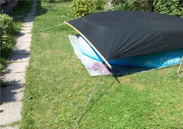 Самодельное покрывало для небольшого дачного бассейна нетрудно сшить из непромокаемой ткани: брезента, полотна ПВХ, ПЭТ мешковины, двухслойного полиэтилена, солярной плёнки. Предпочтение следует отдать материалам тёмного цвета, что поможет ускорить прогрев воды. Фиксируют такое укрытие тросами или верёвками, продев их в сделанные на чехле отверстия или кулиску.