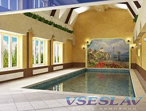 Эта особенность технологии позволяет выполнить практически любой замысел дизайнера и архитектора, а также любой каприз заказчика. А это значит, что соорудить самый изысканный эксклюзивный бассейн и вписать его в любое помещение не составляет для специалистов группы компаний “Всеслав” большого труда. Бассейн может располагаться и в отдельно стоящем здании, и в пристройке к жилому дому, и под крышей специального павильона, и просто под открытым небом.