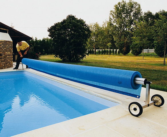 Защита от мусора, даже в виде павильона, не всегда позволяет регулировать температуру воды. Защитить бассейн от остывания поможет солярное покрывало или полотно из нескольких слоев пленки, между которыми находятся пузырьки воздуха. Каждый такой пузырёк работает как мини-теплица, аккумулируя тепло и передавая его воде.