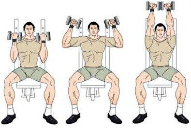 Работа с гантелями помогает развивать плечевой отдел. Наиболее часто выполняемым упражнением является жим сидя