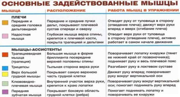 Он уплотняет мышцы и детализирует, отделяет их от окружающей мускулатуры. Большая часть нагрузки приходится на пучки средние и передние, но благодаря специфике движений, работают активно вращатели плеча. Нижеприведенная картинка наглядно демонстрирует спектр задействованной мускулатуры.