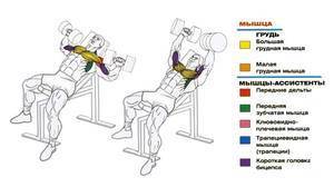 Выполнение упражнения на наклонной скамье (головой вверх) под углом примерно в 45 градусов смещает нагрузку на верхнюю часть больших грудных мышц, эффективно подчеркивая их границы. В меньшей мере работу выполняют передние пучки дельтоидов, трицепс, ротаторная манжета плечевого сустава.